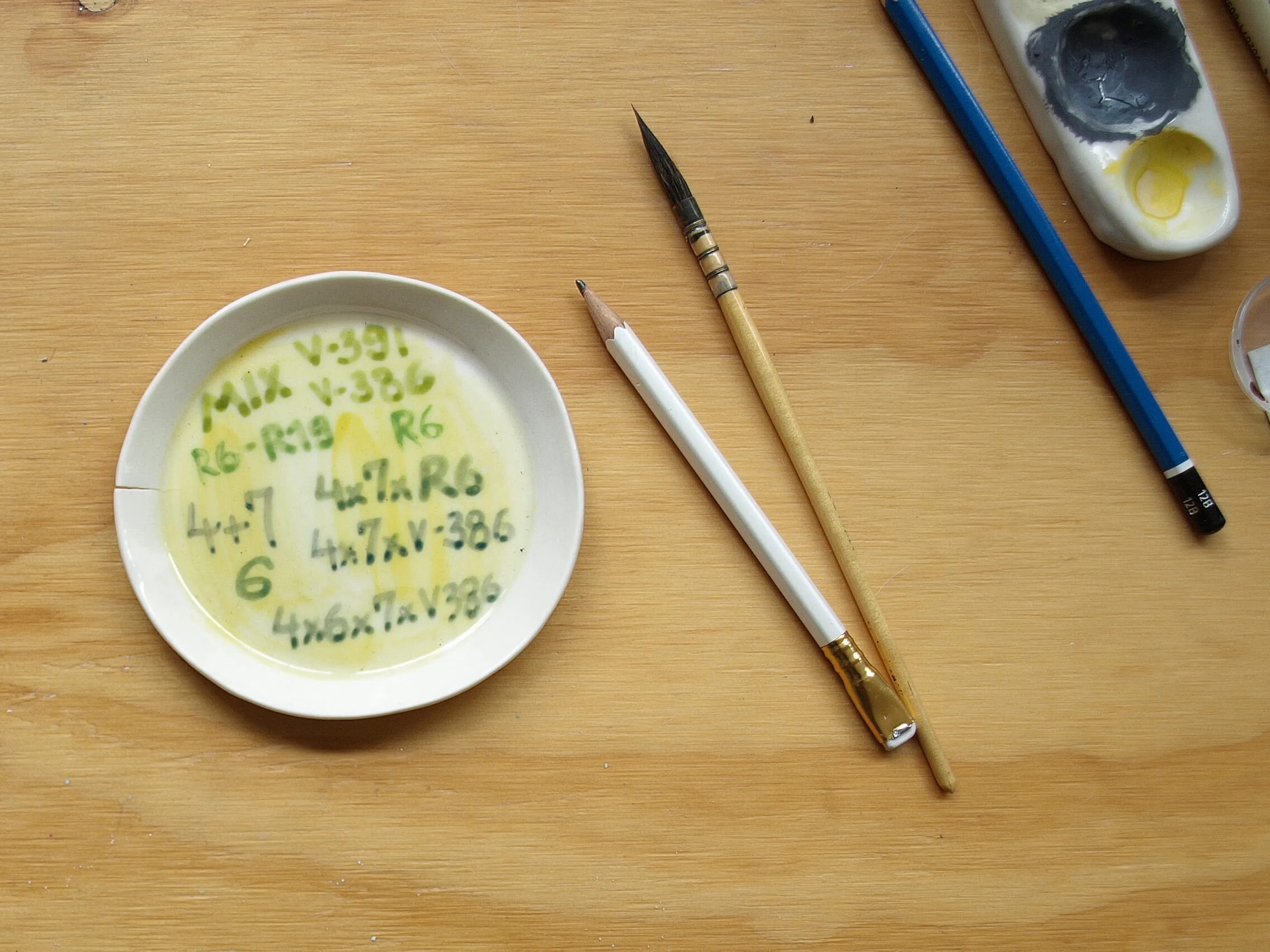 The first step was to see if I had the right underglaze colours. Throughout the many years I have been making pottery I have bought underglazes from various countries and brands. It’s a bit of a mish mash but I tend to paint with the colours I have at hand. Mixing colours requires a lot of time, as you have to test them, so it’s something I try to avoid if I can.