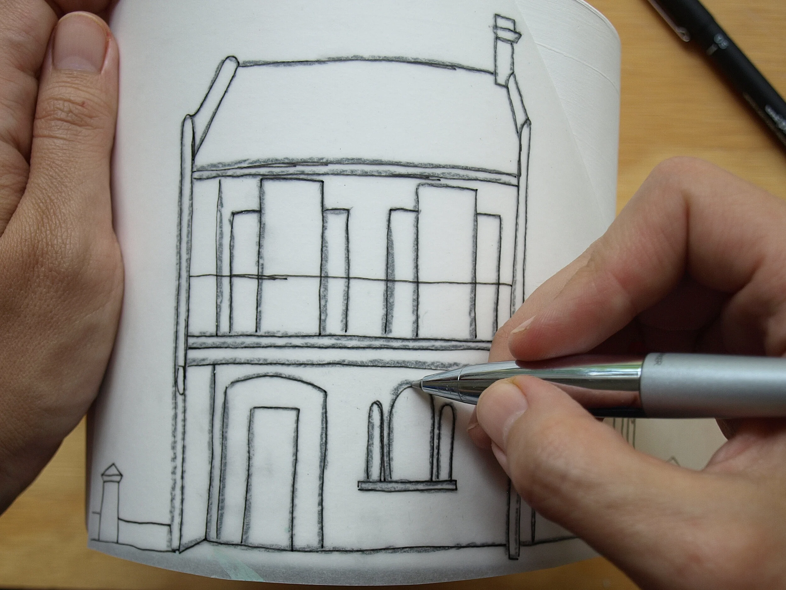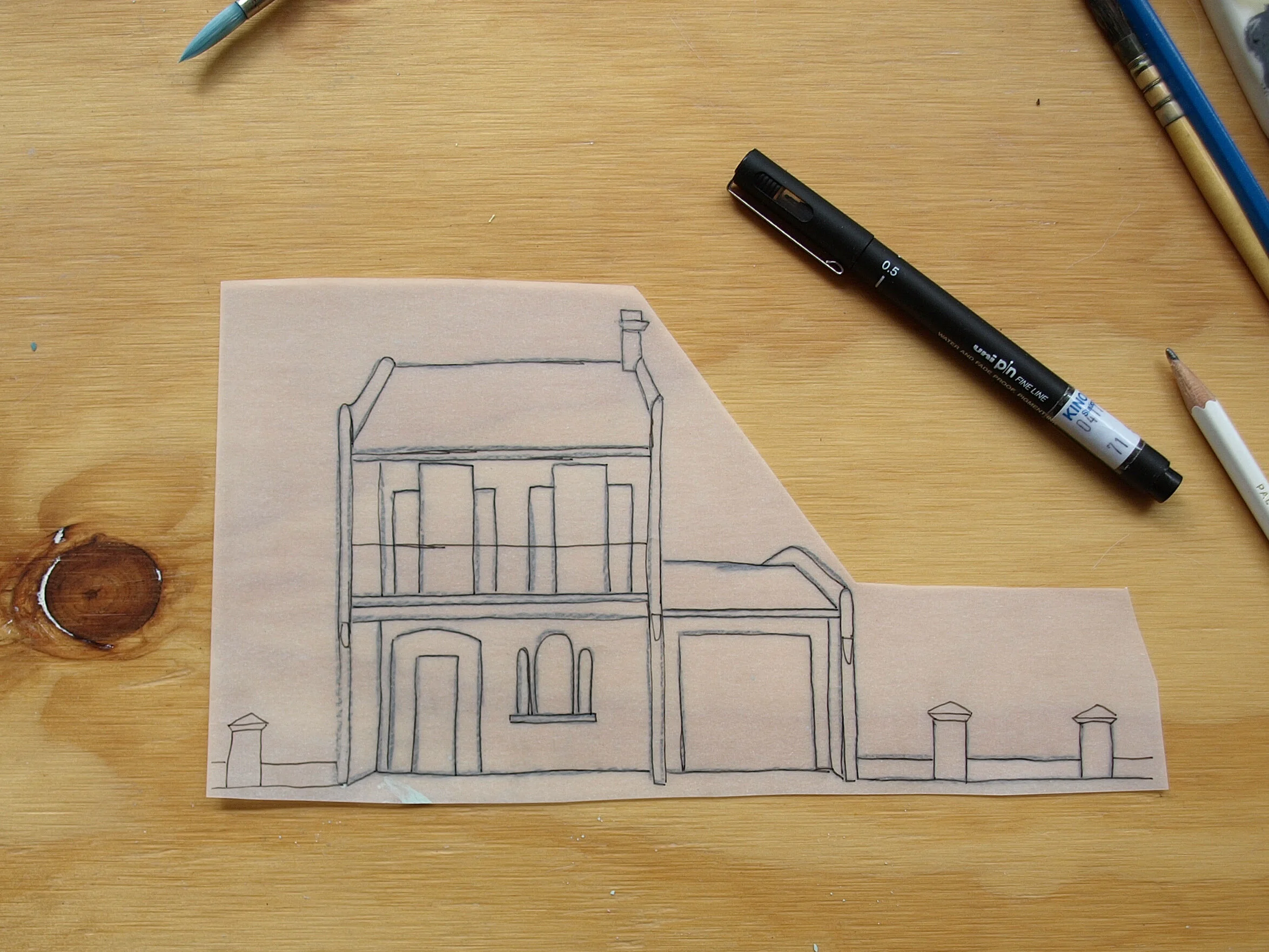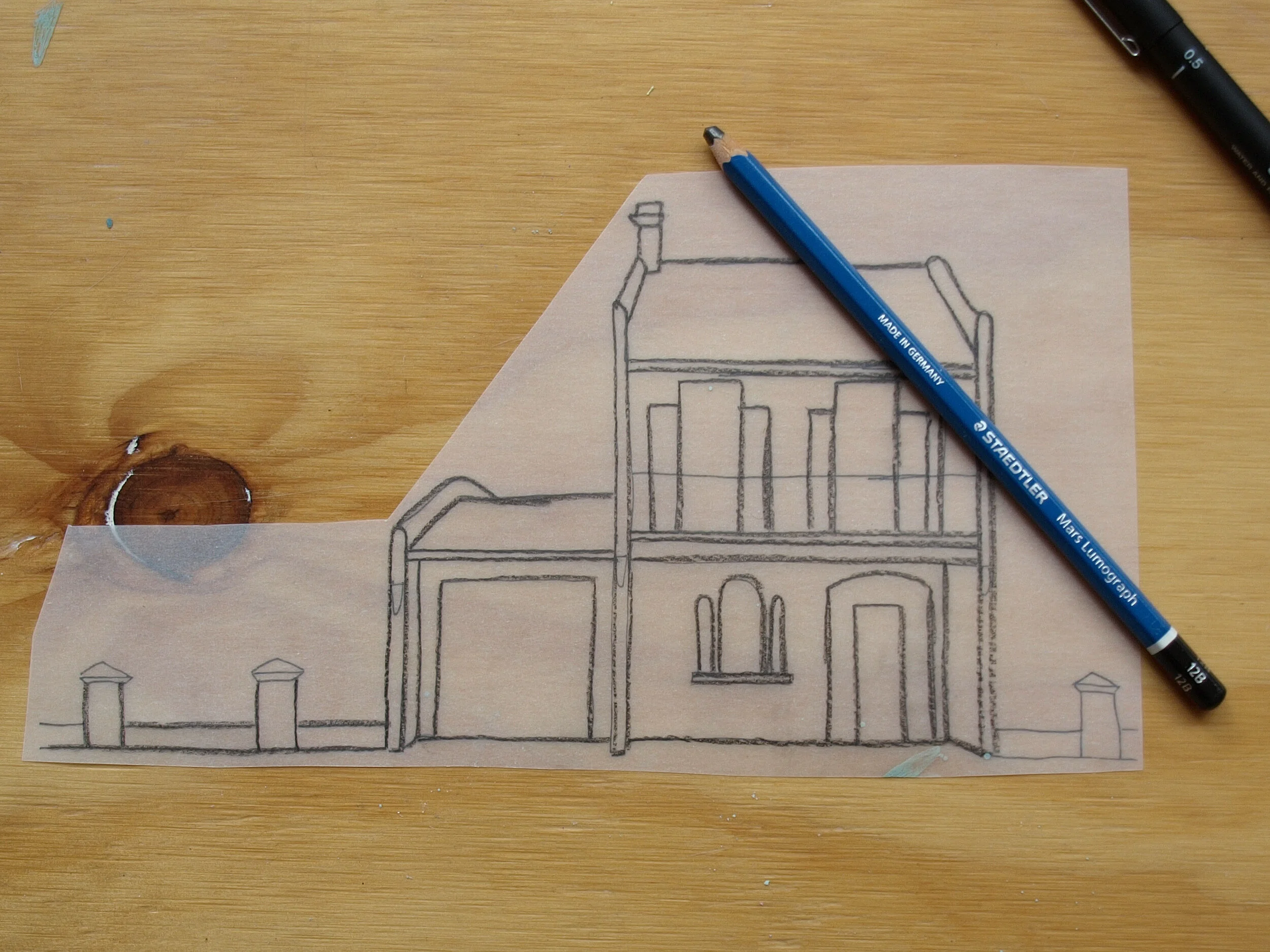 With a sheet of tracing paper and a non-smudging pen, I traced the outline of the building, windows and other features of the house that would be useful to have as guides.