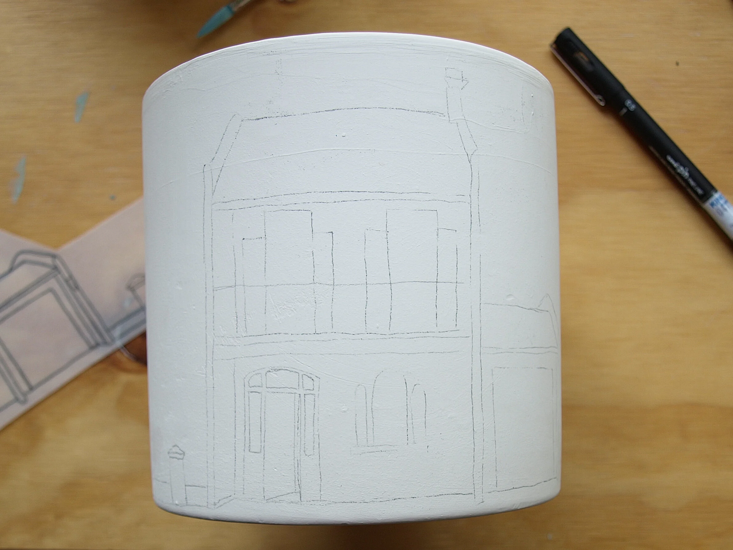 The next step in the process was to sketch up the design of the house itself. I will do these sketches in the same size as the drawing that will go on to the pot. The scale is helpful and it also serves as the basis for the image transfer.